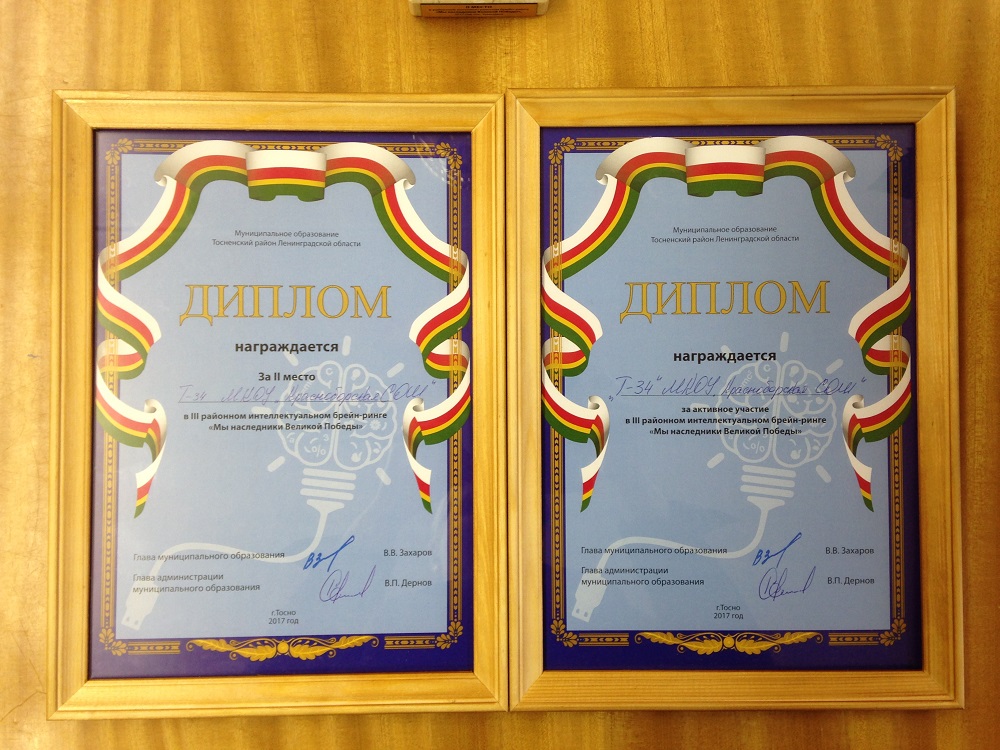 заняла 2-ое место в III-м районном интеллектуальном брейн-ринге «Мы наследники Великой Победы», посвященном году экологии в Российской Федерации, году истории в Ленинградской области и 90-летию со дня образования Ленинградской области.